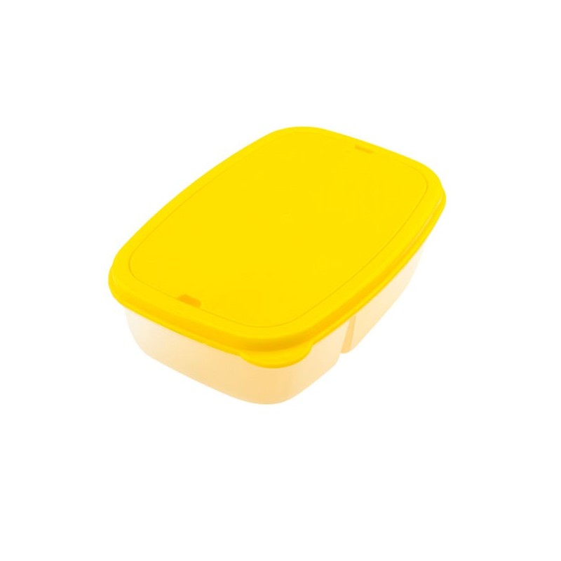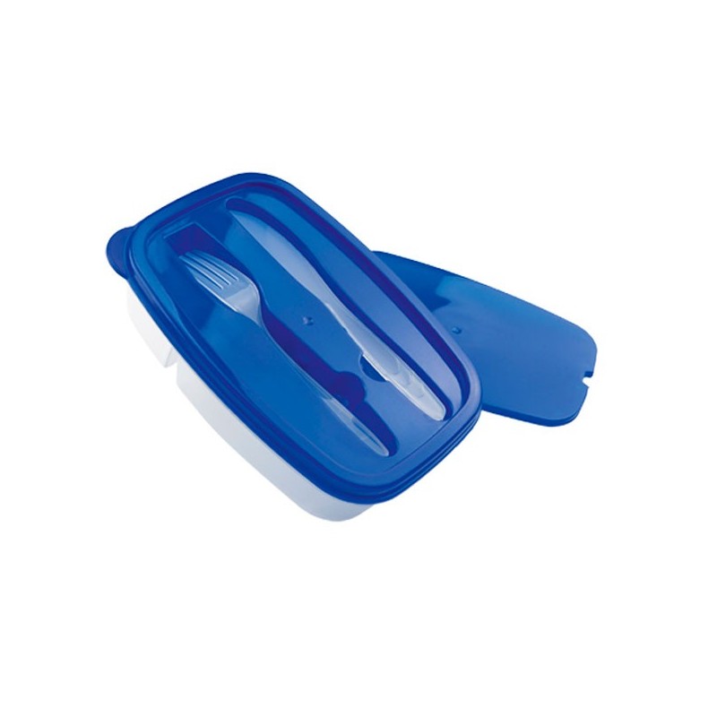 Fiambrera con dos compartimentos, cuchillo y tenedor. Ideal para llevar al trabajo o en un día de campo. Apta para microondas y lavavajillas.